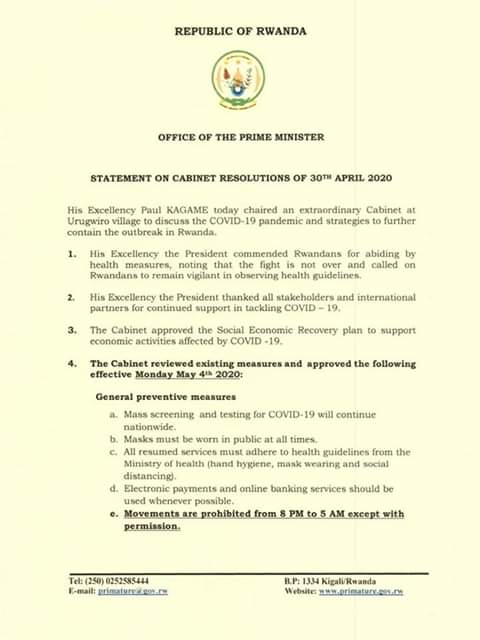 Govumenti ya Rwanda eyihireho emihingo emwe eyiyabaire eteireho nk'omuringo gw'okutangira ekirweire Kya COVID 19 omwihanga ryabo
